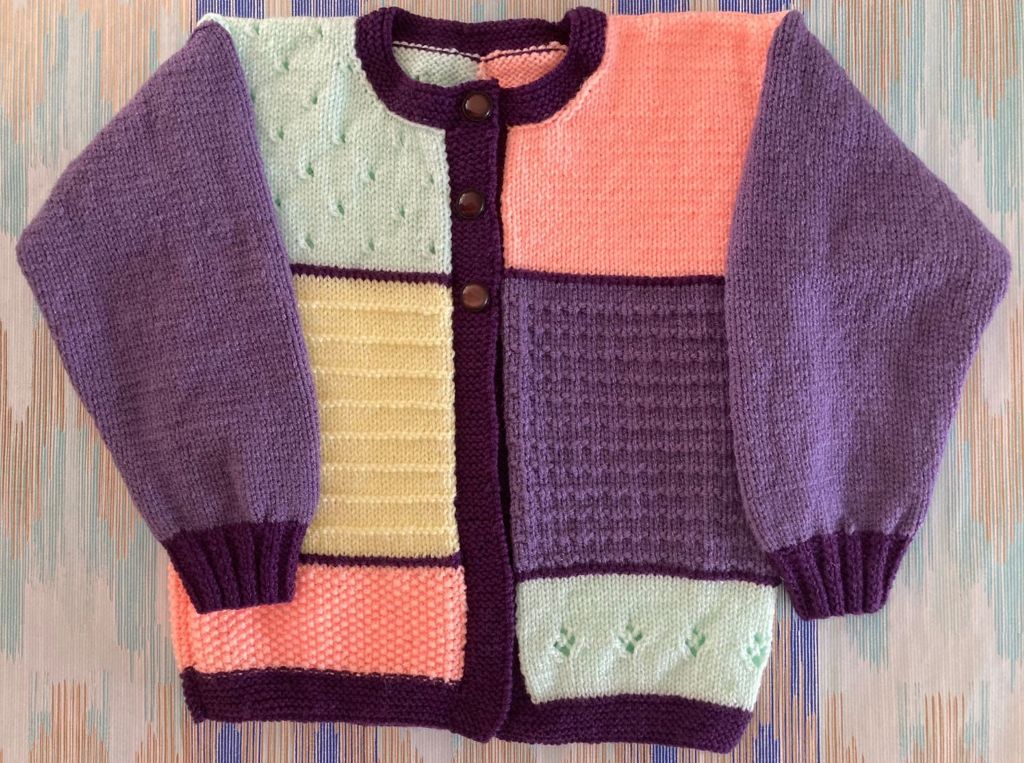 Hand knitted round neck stunning multi-patterned jacket in dark blue, yellow, peach and mint green