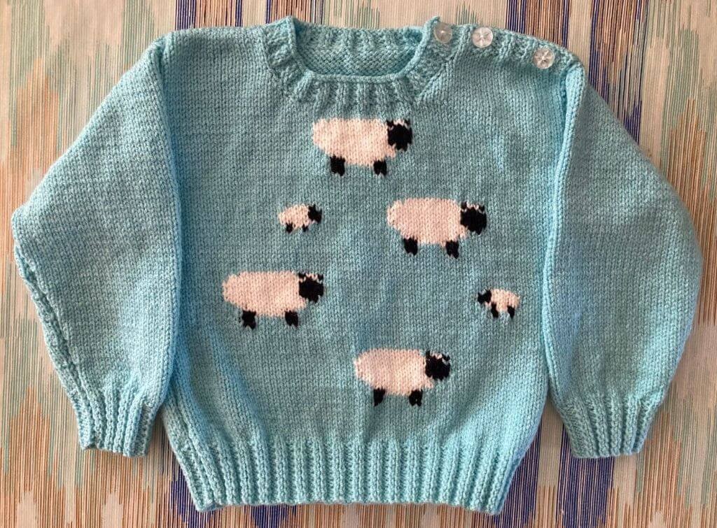 Endearing hand knitted light blue jumper with playful sheep motifs featured on the front