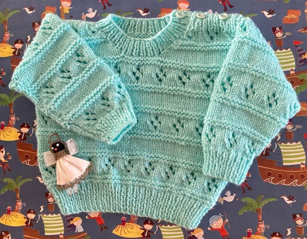 Hand knitted beautiful turquoise cardigan with dainty lacy panels